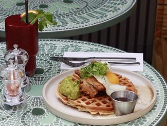 waffle with egg and guacample on the top served with bloody mary