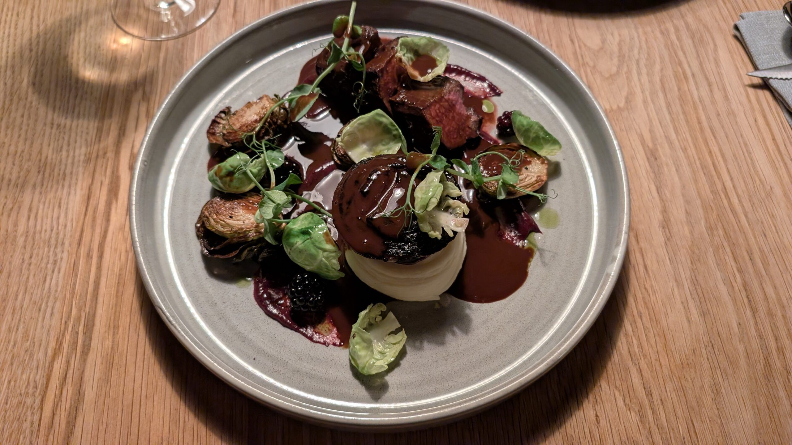 Venison haunch from a local butcher in Bodiam was cooked to perfection, succulent and full of flavour. It was served with creamed potato, burnt Roscoff, sprout tops and the complex and intense blackberry and chocolate jus was spot-on.
