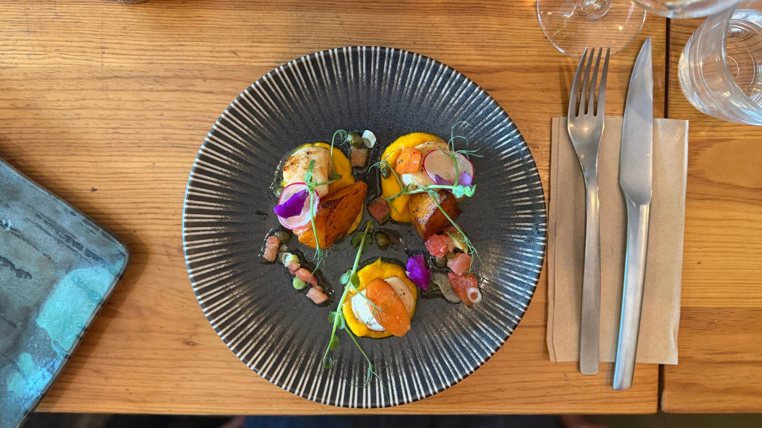 After some umming and ahhing I settled on the scallops. Served on a beautiful squash purée, with a hint of spring onion and decorated with the most delightful little violets and pea shoots, they were divine and full of surprises. With a punch of capers and the bite of radish, Mange Tout was off to a very strong start indeed.