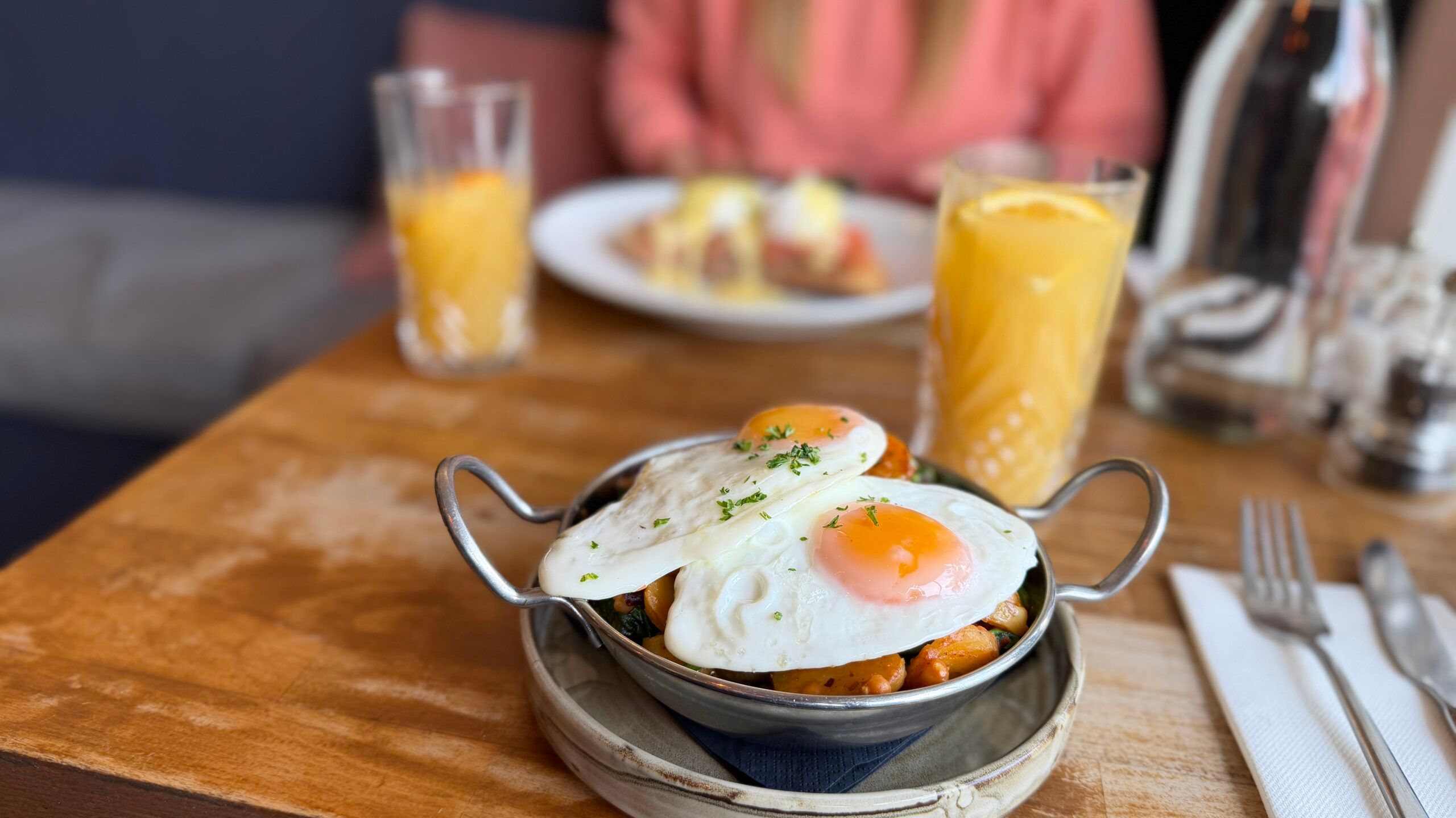 My date opted for the spiced sausage hash, topped with two perfectly runny fried eggs. Generously portioned, with thinly sliced sausages, spinach, beans and chilli flakes, it set him up for the day. Meanwhile, continuing my fish theme, I went for eggs royale – smoked salmon atop crunchy sourdough, with perfectly poached eggs and hollandaise, finished with a sprinkle of chives. All served with orange juice, tea and excellent coffee.
