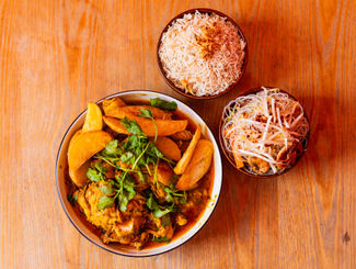 There are always non-vegetarian specials, vegetarian dishes and many vegan options plus rice and noodles on offer. Typical vegetarian/vegan options include Indonesian Sambal Aubergine, Mushroom & Kale Korma, Spinach & Paneer Pastry, Punjabi Aloo Chana and Sweet Potato Casserole.