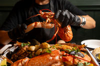 The décor nods to a The Cure concert circa early nineties: rich velvet, dark greens and ornate chandeliers. Look closer, and the place reveals its sense of humour – a nifty lobster-topped telephone; monocled, top-hatted crab branding; and gold-leaf patterning glistening under low, amber lighting.